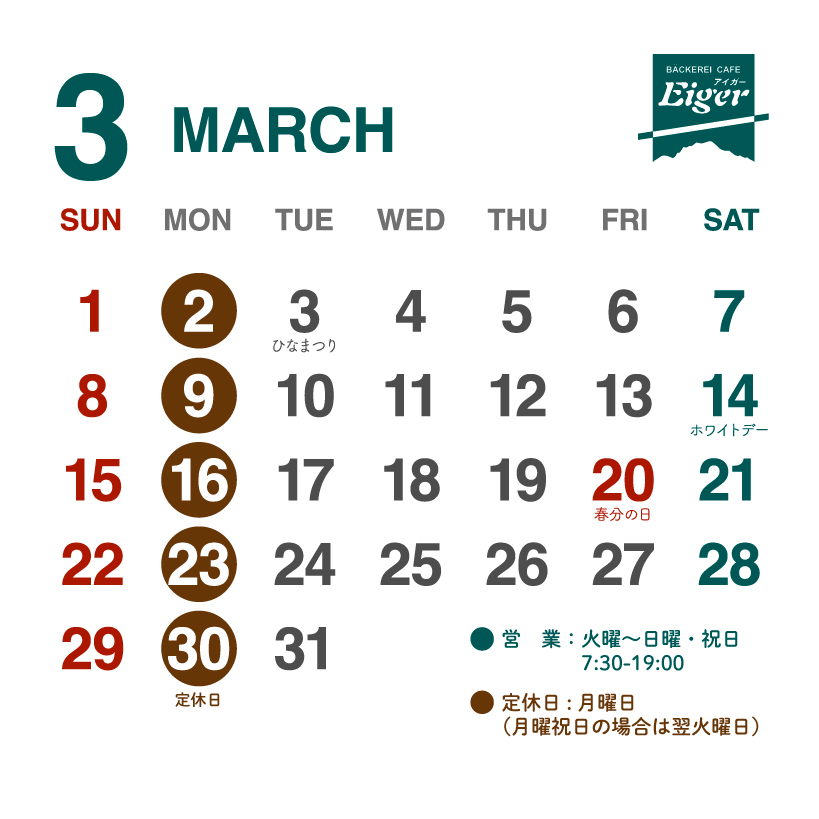 3月営業日のお知らせ